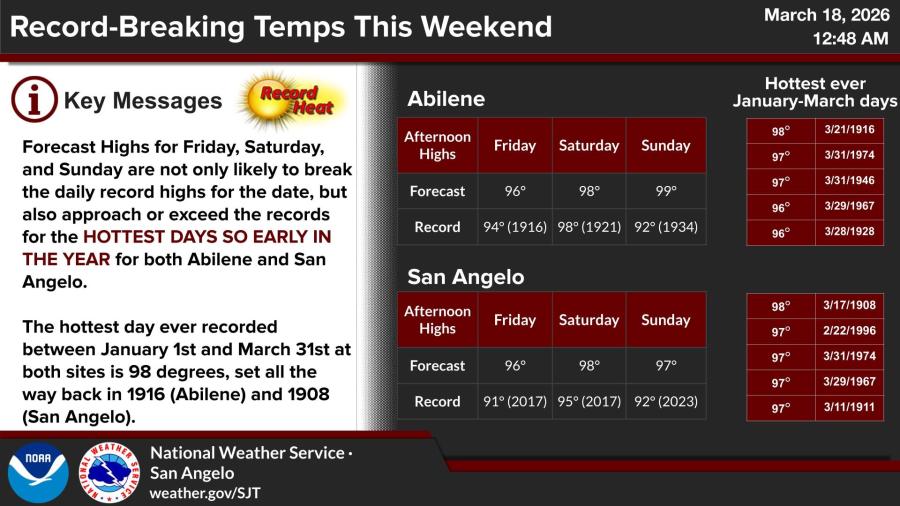 The agency’s San Angelo office said afternoon highs are forecast to reach 96 degrees Friday, 98 Saturday and 99 Sunday in Abilene — topping the previous records of 94 degrees set in 1916, 98 in 1921 and 92 in 1934. In San Angelo, the forecast calls for 96 Friday, 98 Saturday and 97 Sunday, surpassing records of 91 degrees in 2017, 95 in 2017 and 92 in 2023.