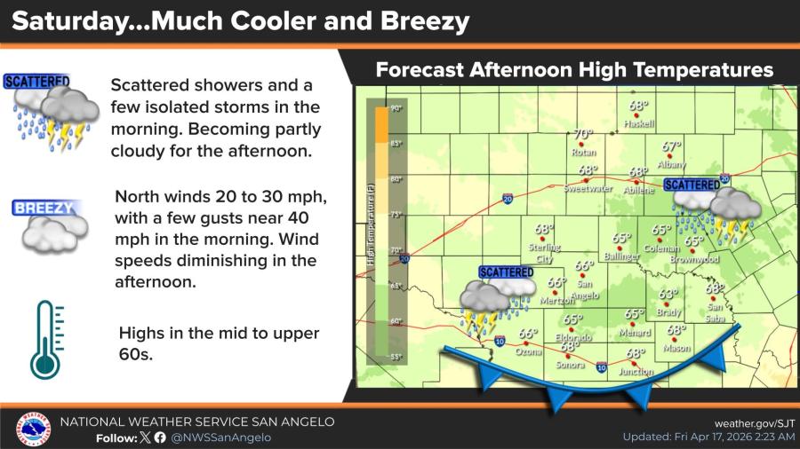 Saturday will turn much cooler and breezy behind the cold front. Scattered showers and a few isolated storms are possible mainly in the morning, becoming partly cloudy in the afternoon. High temperatures will only climb into the mid to upper 60s under north winds of 20 to 30 mph, with gusts near 40 mph early in the day.