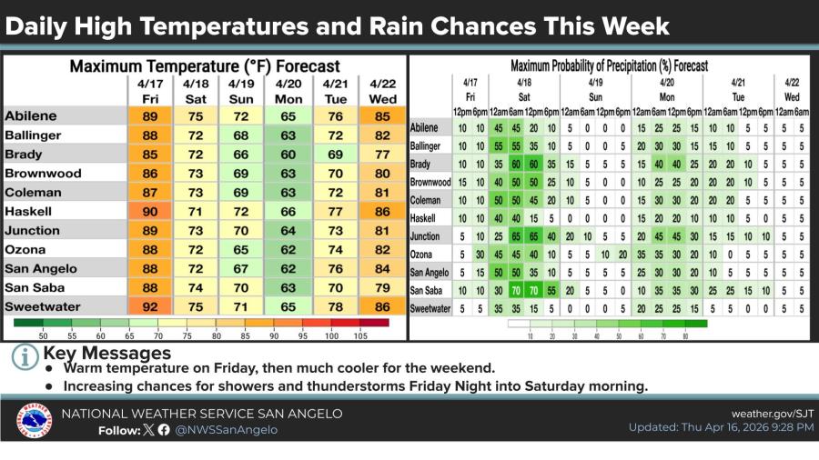SAN ANGELO, TX — Rain and thunderstorm chances will continue from Friday afternoon through Saturday morning across much of West Central Texas as a strong cold front moves through the region.