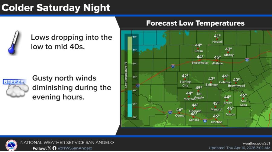 Low temperatures Saturday night are expected to drop into the low to mid 40s, with gusty north winds diminishing during the evening hours.