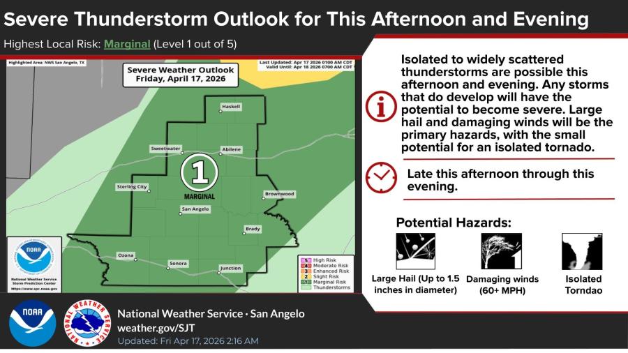 The National Weather Service in San Angelo has placed the area under a marginal risk of severe thunderstorms for this afternoon and evening. Isolated to widely scattered storms are possible, with the main threats being large hail up to 1.5 inches in diameter, damaging winds of 60 mph or greater and a small potential for an isolated tornado.