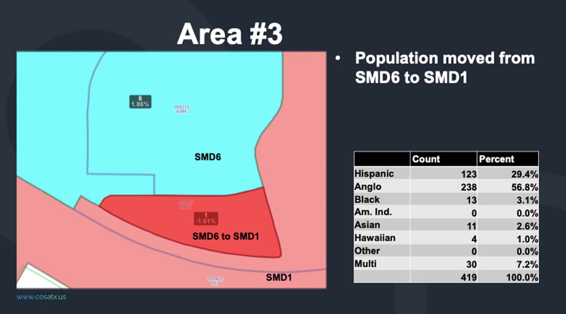 One of the biggest points of contention discussed during the forum was the decision to change a section of SMD 5 property to SMD2. In the presentation, the city stated while no one lived in that area, it had been incorporated to ensure the highlighted areas of SMD 6 would have a physical boundary with SMD 2.