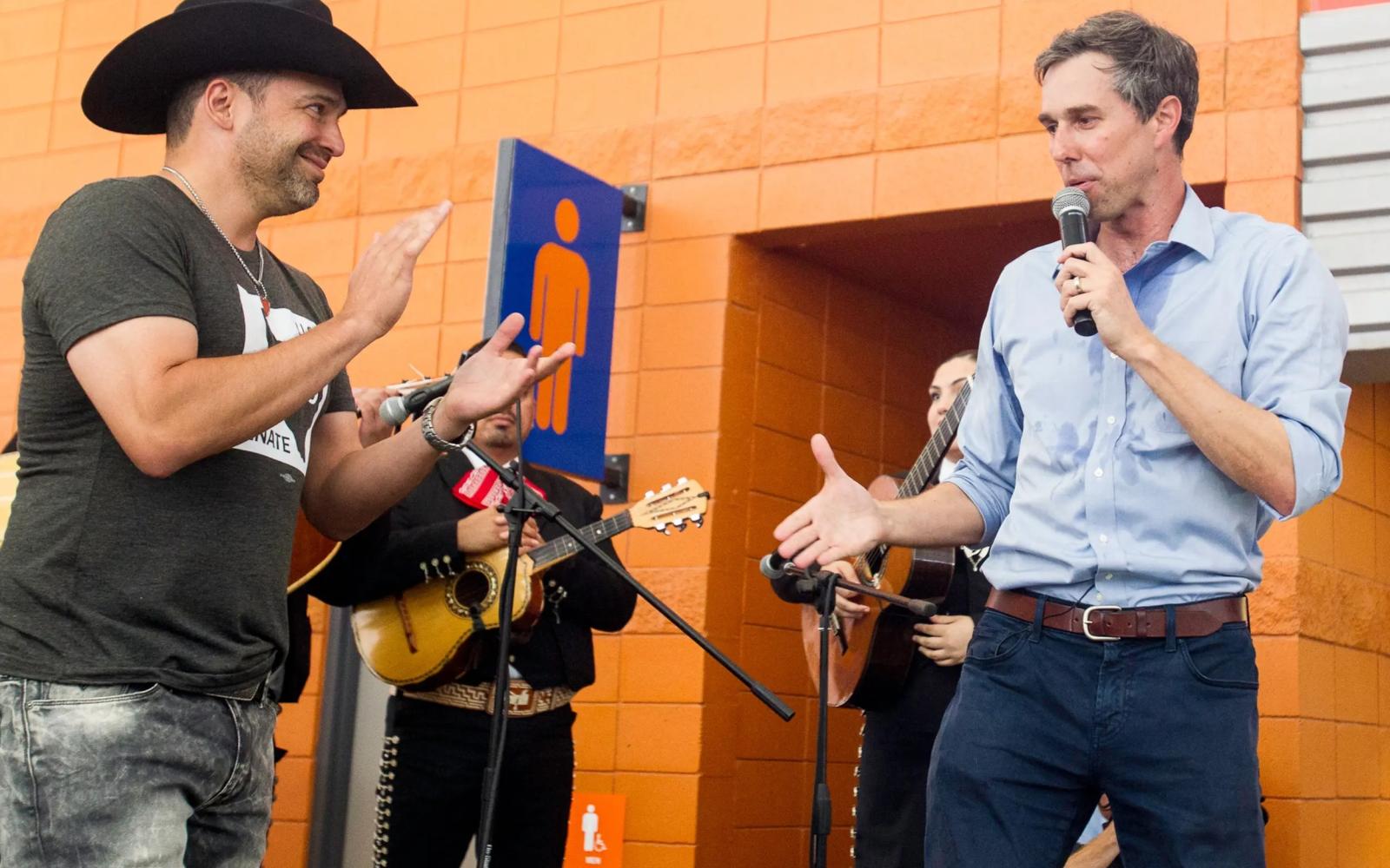 Tejano music star Bobby Pulido joins then-Senate candidate Beto O'Rourke during a campaign rally at HEB Park in Edinburg on May 1, 2018. Credit: Douglas Young for The Texas Tribune