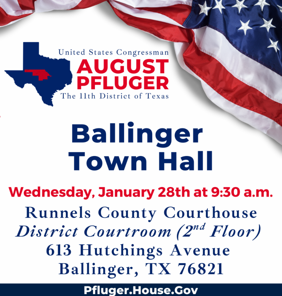 BALLINGER, TX — U.S. Rep. August Pfluger, R-Texas, will hold a community town hall meeting in Ballinger on Wednesday to meet with constituents in his 11th Congressional District.