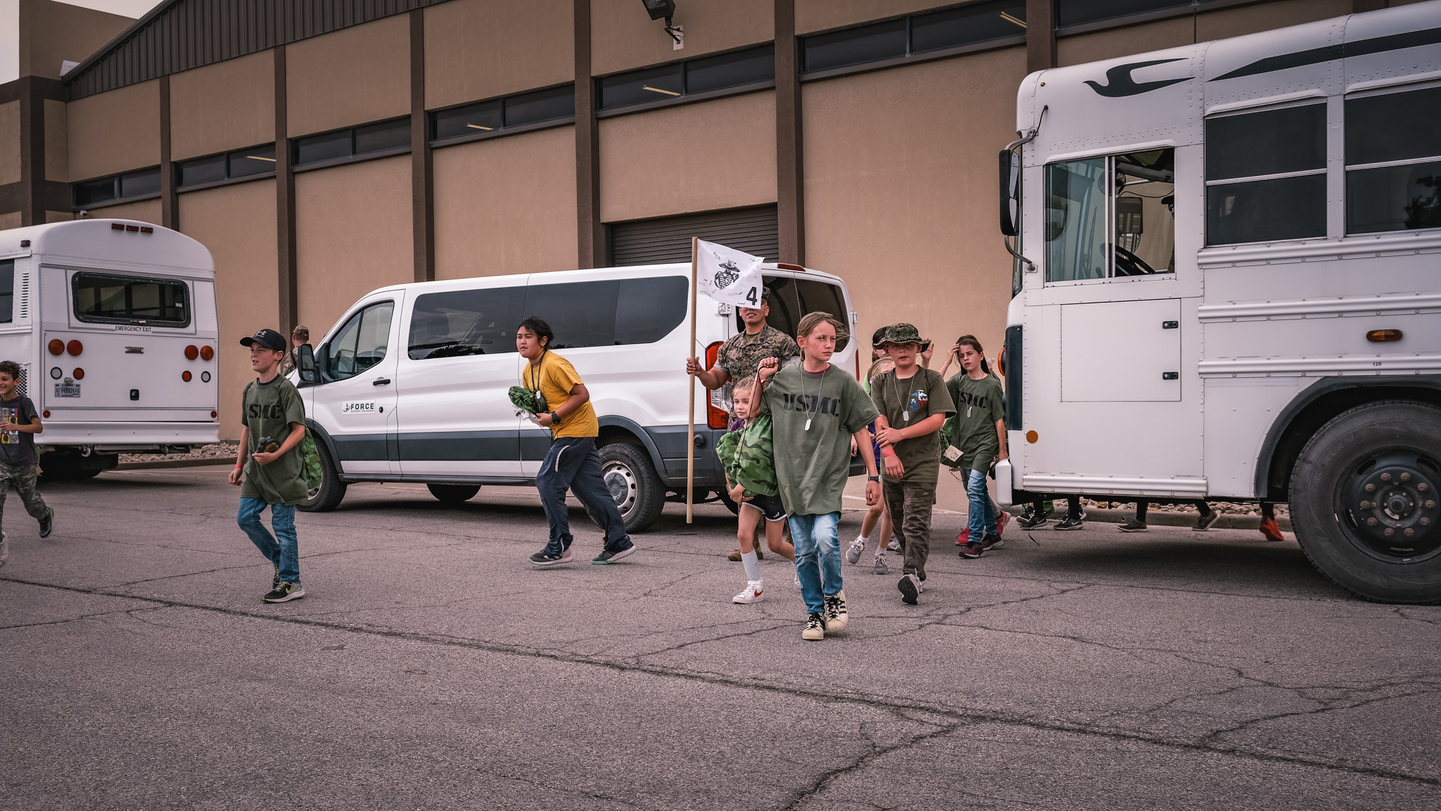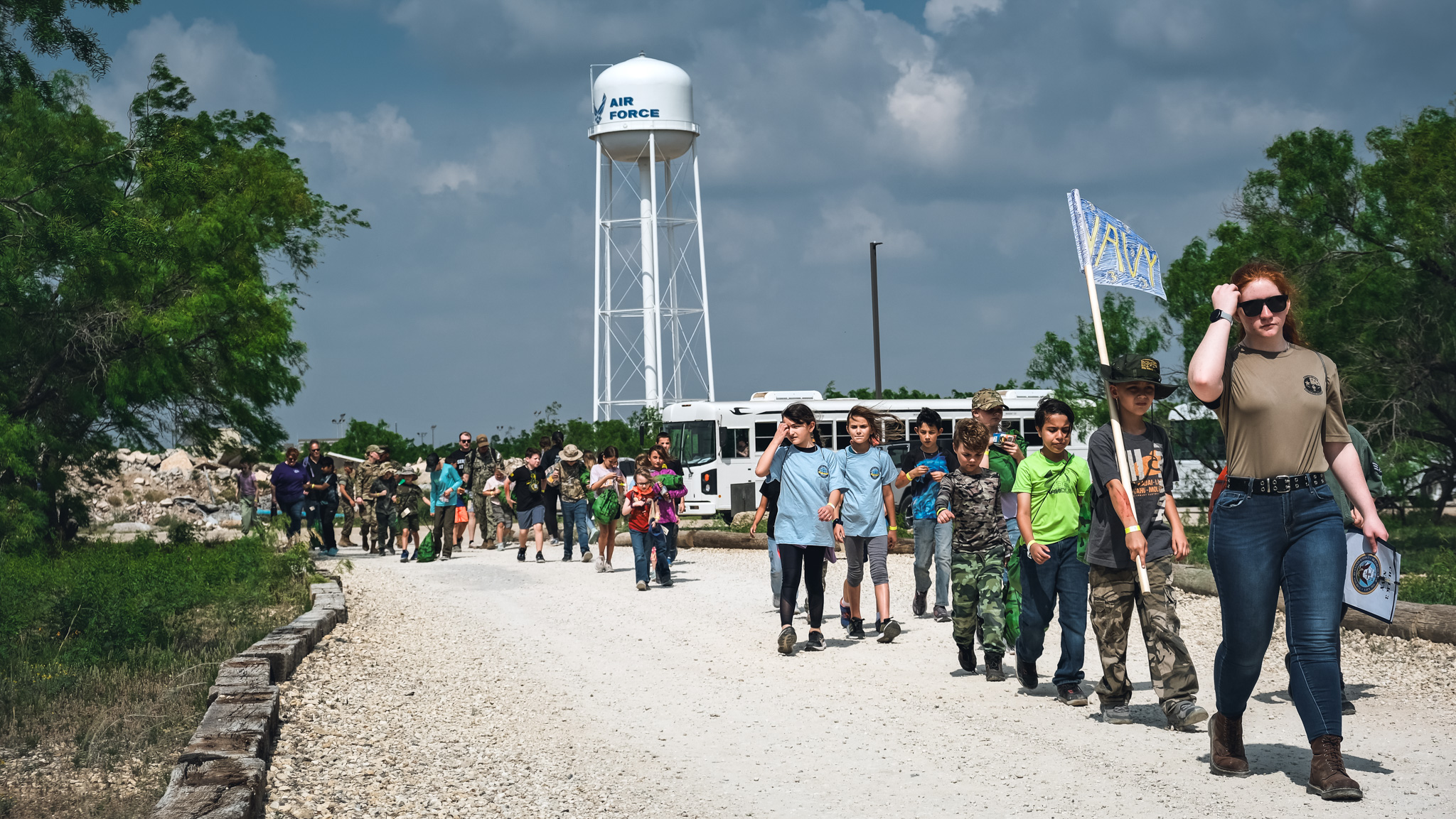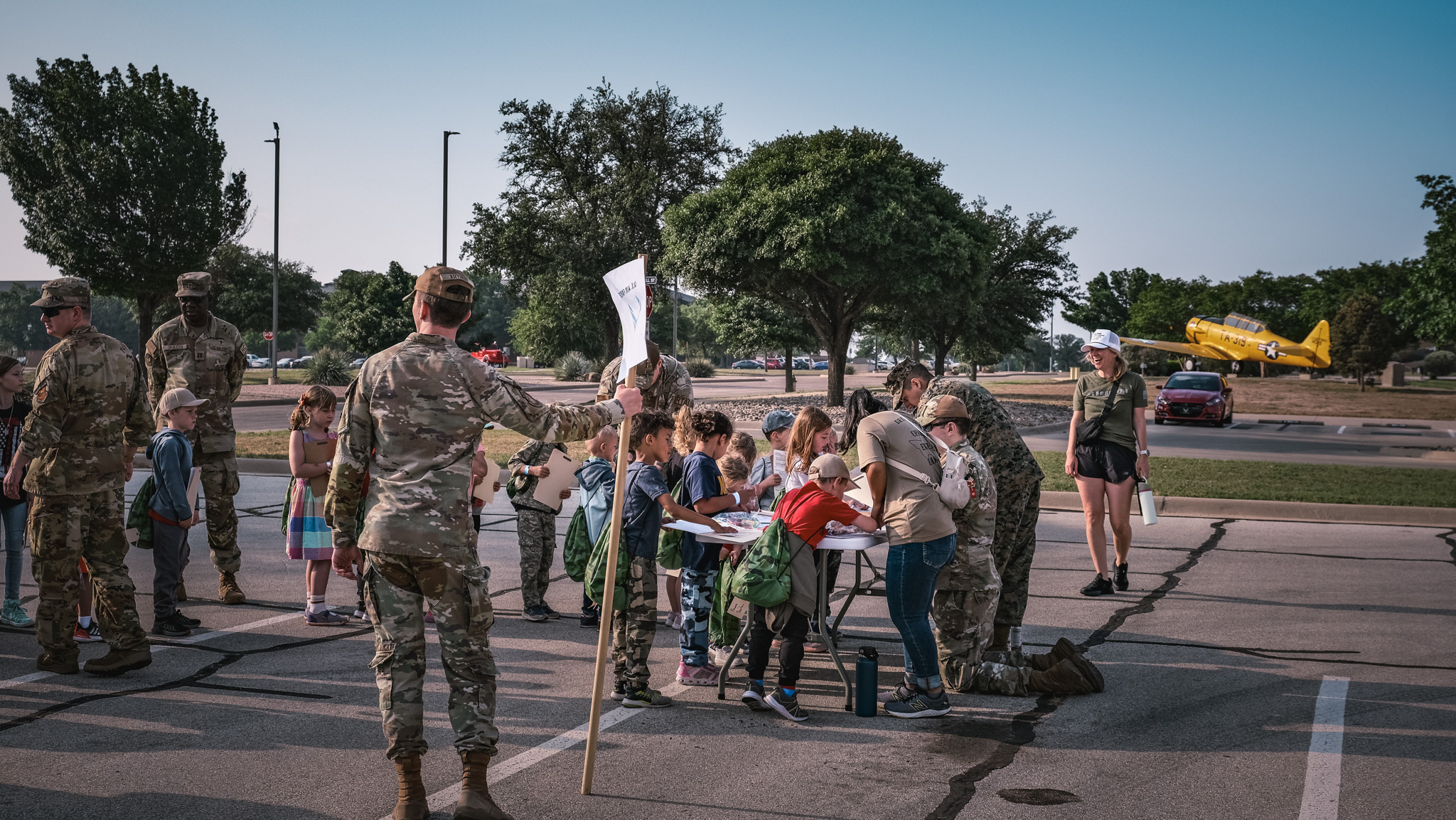 The five chalks represented the Air Force, Space Force, Marines, Navy, and Army. Actual service members lead all the kids within the chalks.