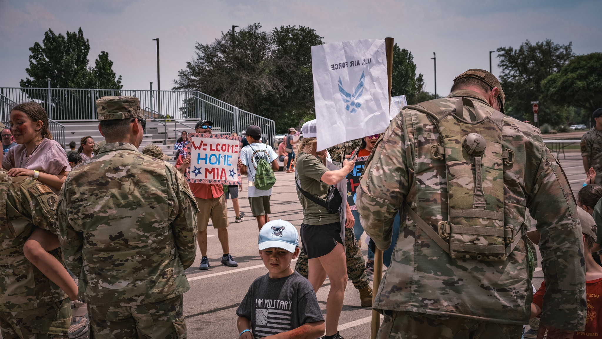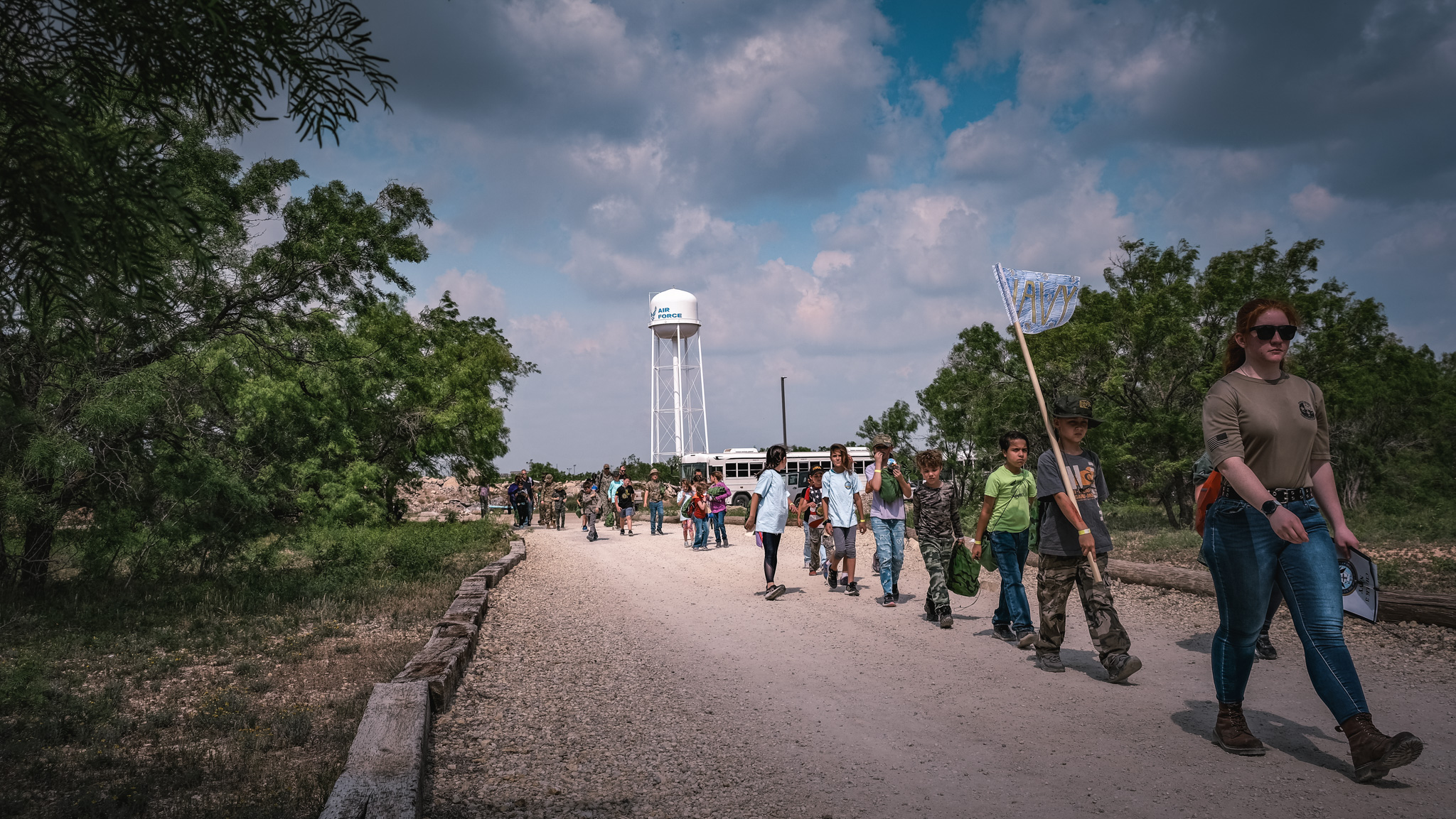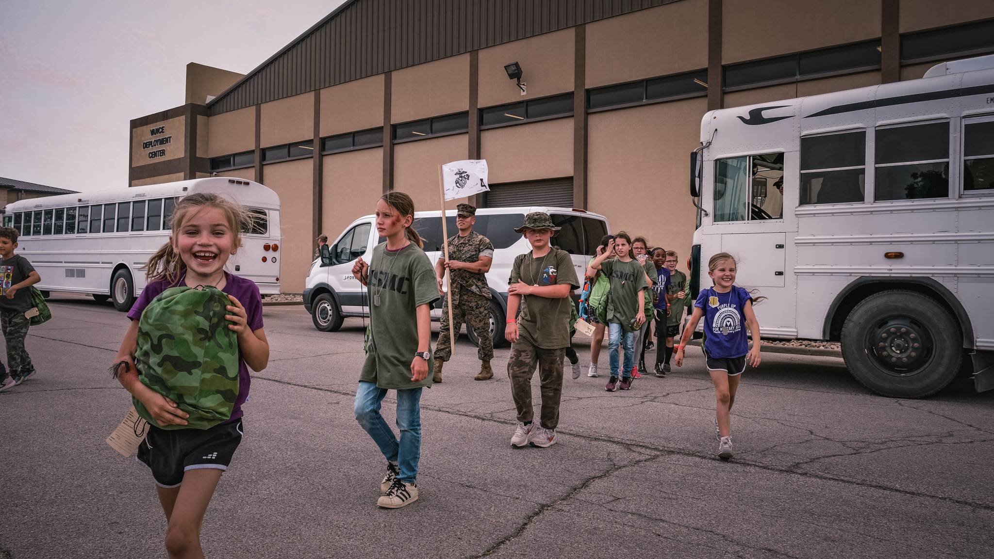 The five chalks represented the Air Force, Space Force, Marines, Navy, and Army. Actual service members lead all the kids within the chalks.