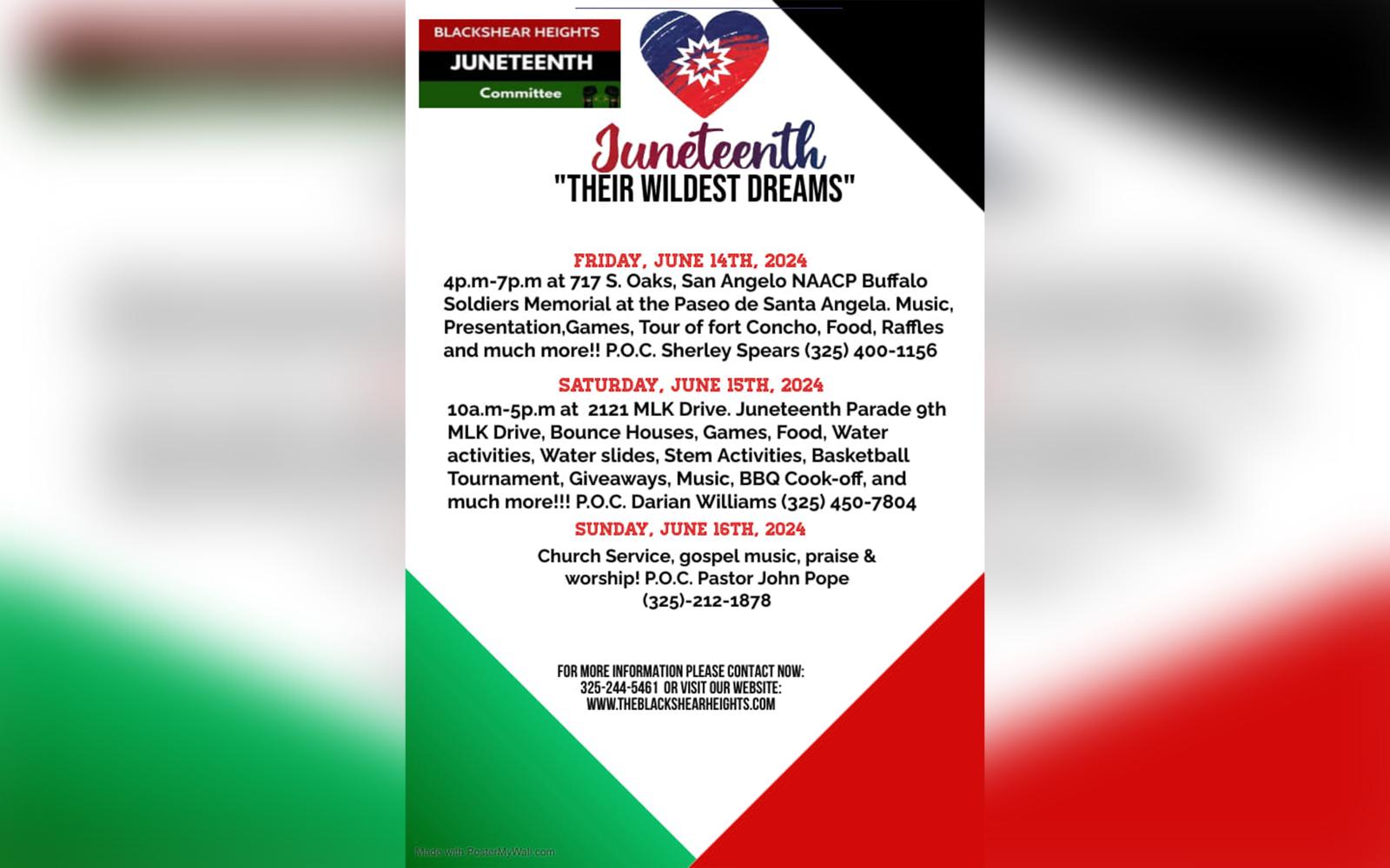 SAN ANGELO, TX – The Blackshear Heights Juneteenth Committee is hosting a three-day celebration for Juneteenth under the theme “Their Wildest Dreams.”