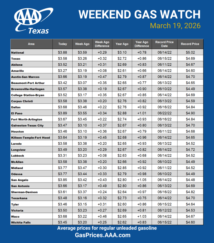 SAN ANGELO, TX — Gas prices continued to spike upward at a rapid pace for a third straight week in Texas and throughout the U.S., according to the AAA Texas Weekend Gas Watch. The statewide average of $3.58 is 32 cents higher than a week ago, while the U.S. average of $3.88 is 29 cents higher than a year ago and is likely to top $4 a gallon in the next week if gas prices continue their rapid rise.