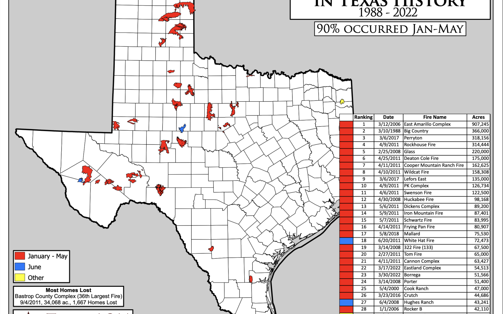 The largest, the East Amarillo Complex in 2006, covered 907,245 acres. The Big Country Fire in 1988, now the third-largest, burned 366,000 acres, followed by Perryton in 2017 at 318,156 acres, and Rockhouse Fire at 314,444 acres.