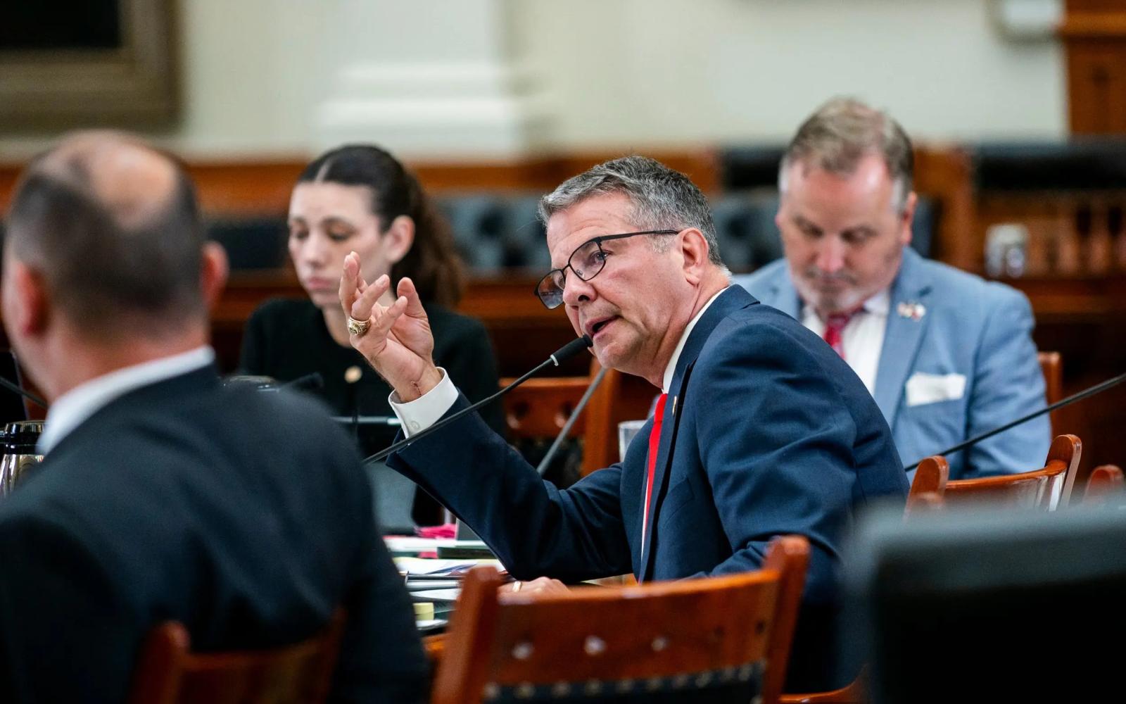 Texas Sen. Charles Perry, R-Lubbock, speaks during a public hearing on his bill to ban THC at the Capitol's Senate Chambers on Tuesday. Credit: Ronaldo Bolaños/The Texas Tribune